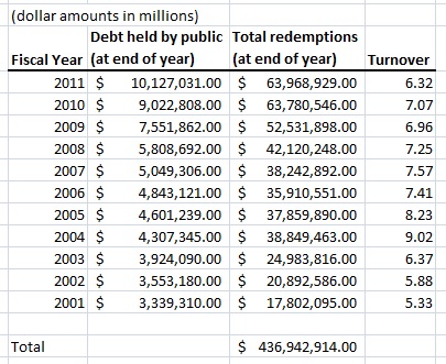 Nice article by Ben Strubel entitled, "Who’s Afraid of the Big, Bad National Debt?" where he points out, as I have in the past, that we "pay off" many trillions $$ each year--far in excess of the amount outstanding--without even so much as a hiccup.